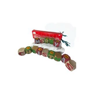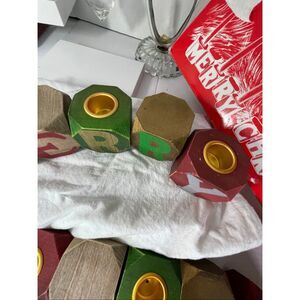 Vintage Merry Christmas primitive wooden block candle holders. Made in Taiwan. Wooden cube shaped letter blocks. The ones with gold rings on tops fit tapered candles . Like new condition. Still in original wrapping and box.