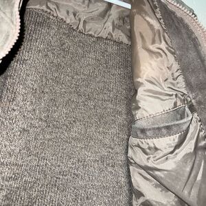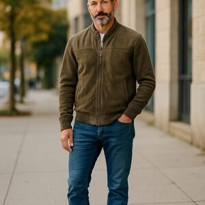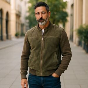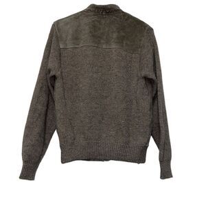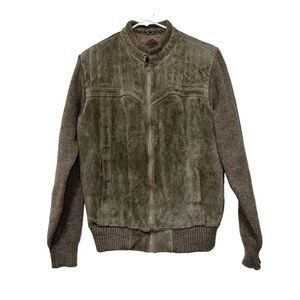 This is a pre-owned men's suede jacket by Mervyn's. It is a size L and is made in Korea. The jacket is brown in color and features a full-zip closure, a stand-up collar, and two front pockets. The sleeves are made of a knit material that is 73% acrylic, 15% wool, 12% polyester. The body of the jacket is made of cow split leather. The lining is 100% nylon. The jacket has a few minor signs of wear, including some fading on the suede and a few small snags in the knit fabric. Overall, the jacket is in good condition and is ready to be worn.