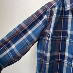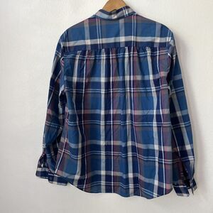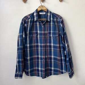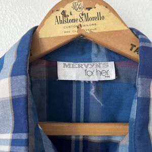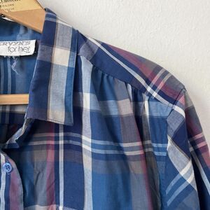 Vintage Mervyns womens blue pink pleat roll tab sleeve blouse button fits M/L