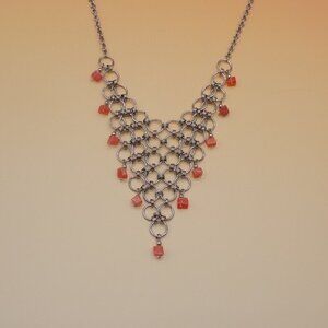 Vintage Mesh Choker Bib Necklace Silver Tone Orange Glass Square Beads