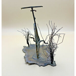 This vintage metal art sculpture is a unique piece that will add a touch of retro charm to any space. The sculpture features a copper rust tin high wheel bicycle with intricate details and a rustic finish. It is a handmade piece signed by an unknown artist, making it a one-of-a-kind find. Measuring small in size, this sculpture is perfect for table decor, shelf sitting, or as a knick knack. The piece is an original from the 1970s and was produced using metalwork techniques. The sculpture captures the essence of nature, art, and cycling.