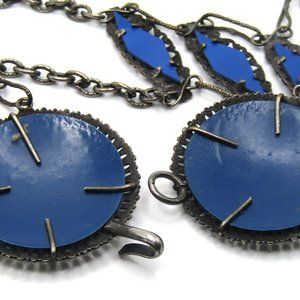 Vintage metal filigree belt with blue thick plastic. I do not know the origins or age of this belt and I do not see a maker's mark. Very unusual piece in very good, vintage condition.
