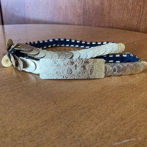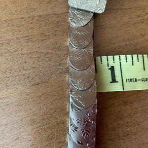 Fun gold tone fish scale segmented stretchy belt. Vintage 80s. Leaf and Vine design on the metal segments and buckle. Belt is approximately 1/2" wide - buckle is approximately 1/3/4" across and 1/2” wide. Total length is 28 inches. Belt has elastic back and stretches to fit. Very Good vintage condition.