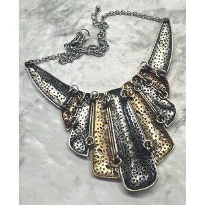 This statement necklace features an artistic blend of metal pieces in silver, bronze, and copper tones, beautifully arranged in a bib style. The intricate swirl patterns add an elegant touch, while the adjustable chain ensures a comfortable fit. Ideal for enhancing a sophisticated look.