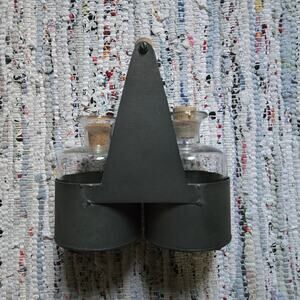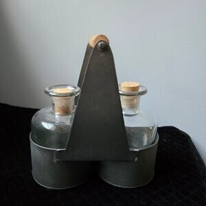 Great vintage condition, farmhouse aesthetic metal Caddy with wood handle and 2 glass bottleneck containers with corks. Perfect for olive oil and vinegar, plants, and more!