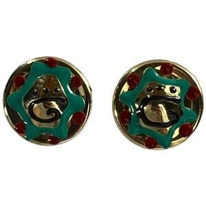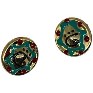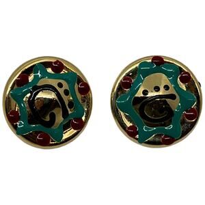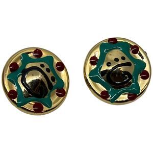 Vintage Metal Clip-On Earrings – Gold, Red, Green & Black, 1" x 1", Retro Design