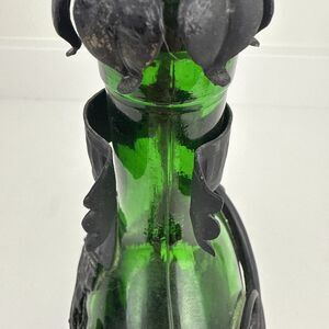 Vintage Metal Encased Wine Bottle w/ Iron Handle Green Glass Ornate With Cork