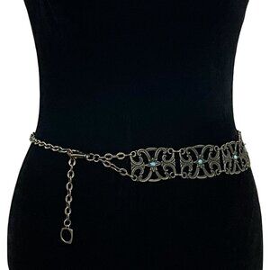 • Vintage early 2000s metal chain belt featuring a series of interconnected links with a flower and scroll design