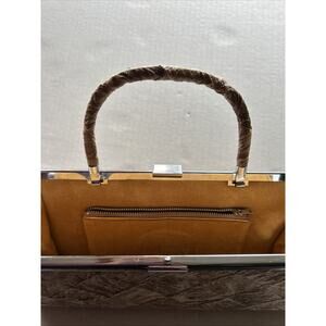 Vintage Metal Framed Clutch Brushed Earth Tone Material Yellow Velvet Lined 1950