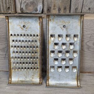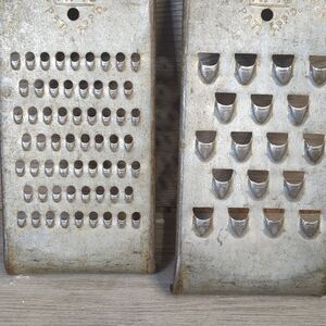 Set of two vintage metal cheese or vegetable graters. Perfect for kitchen decor or use.