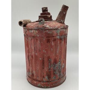 This vintage metal can with a red color and a wooden handle and spout is perfect for collectors of gas and oil memorabilia. The can is an original piece and is ideal for storing oil or gas. The brand of the can is unknown, adding to its uniqueness and character. This item is a great addition to any collection and is perfect for display in a garage or man cave.