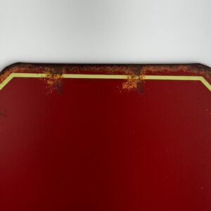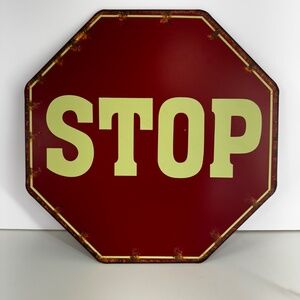 Add a bold, eye-catching statement piece to your space with this vintage-style metal STOP sign. Measuring approximately 12 inches across, this octagon sign features a distressed red background with bold cream lettering and authentic rustic wear around the edges, giving it a classic aged look. Perfect for collectors, man caves, garages, dorm rooms, or unique wall décor, this piece brings character and charm to any setting.