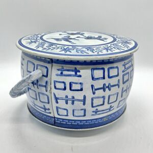 This is a vintage Fricke & Nacke metal tin from Western Germany. Has a twisted rope style handle and blue/white colors. Does have patina as pictured, measures 4" tall and 6" diameter.