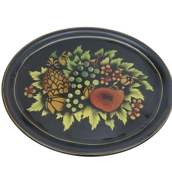 Vintage Metal Toleware Tray Fruit & Leaf Design Black Gold Mid-Century Pineapple