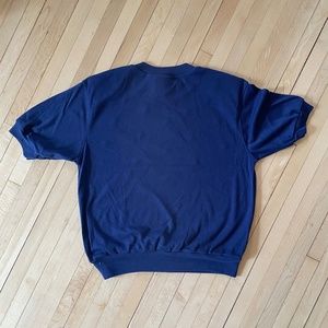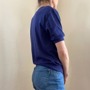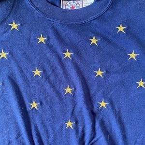 Vintage blue shirt with embroidered metallic gold stars which are made with shiny thread. Shirt has ribbed knit armbands, neckband, and waistband.