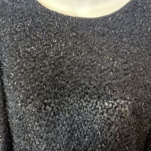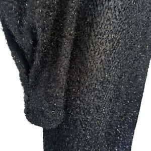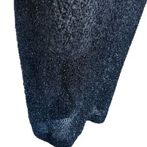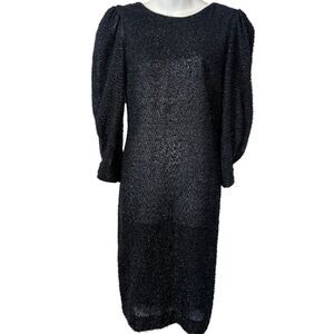 This vintage Leslie Fay dress is a whimsical piece with a gothic touch, featuring a solid black lace fabric with metallic textured details. The dress has a high neck and puff sleeves, giving it a witchy and elegant look. The midi length and shift style make it suitable for formal occasions or parties. The zipper closure adds a modern accent to this vintage piece, which is machine washable and a size 6. Perfect for those who appreciate unique and statement-making vintage fashion pieces.