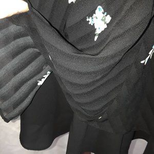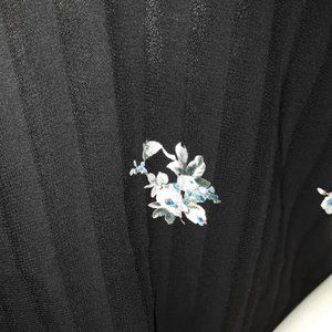 Beautiful black, striped, sheer chiffon fabric is adorned with a cute floral pattern. This airy, circular cut top is lined with a solid black chiffon and has a scooping v-neckline. Circa Y2K. Excellent pre-loved condition with no major defects to note. 100% polyester.