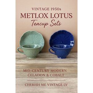 Add a touch of mid-century California charm to your table with these vintage 1950s Metlox Lotus teacup and saucer sets, crafted in Manhattan Beach, California. Each set is molded in a delicate lotus flower motif with petal relief detailing and finished in Metlox’s signature glossy glaze.