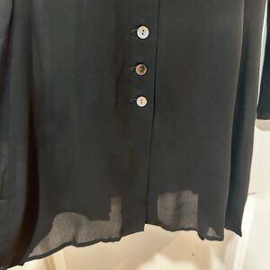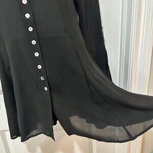 This sheer dress is unlined, has a scoop neckline, front functional buttons running down the dress's length, and at the sleeves' hem.
