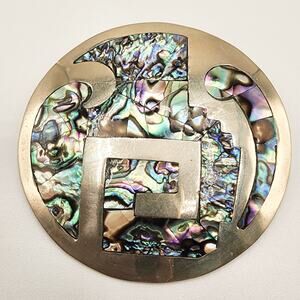 The abalone shimmers with iridescent greens, purples, and blues, beautifully contrasting the smooth silvery alloy. Measures about 2 inches across with a secure roll-over clasp.