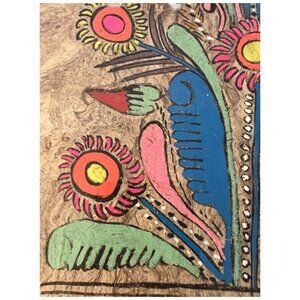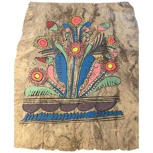 Vintage Mexican Amate Bark Painting – Floral Hand-Painted FOLK ART w/ Burlap Mat