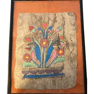 Keywords: Mexican folk art, vintage Mexican art, Otomi art, Nahua art, Otomi painting, Nahua painting, floral folk art, hand-painted amate paper, bark paper painting, boho wall art, rustic Mexican decor, 1980s Mexican art, folk art flowers, orange burlap mat, bohemian vintage art, nature-inspired art, handcrafted amate paper, bark painting