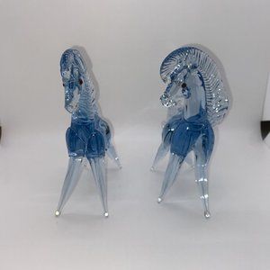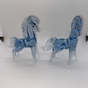 2 Vintage Mexican Art Glass Horse Blue And Clear Hand Blown 9" Rearing Stallion.