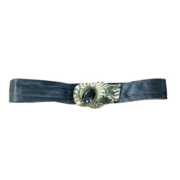 Vintage Mexican Artisan Belt Black Leather Wide Brass Sculptural Buckle Boho MCM