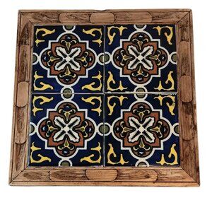 Vintage Mexican Carved Wood Frame Four Inlaid Blue Yellow Tile Trivet Hot Plate