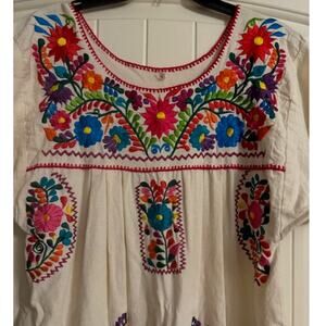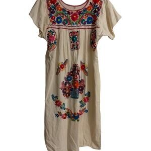 Vintage Mexican Floral Embroidered Flax Muslin Hemp Huipil Dress M