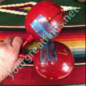 Pair of 1950s Mexican maracas made of gourds. They have wooden handles. Hand painted Souvenirs of Mazatlan. They are 8" long and 3" in diameter. Nice vintage condition.
