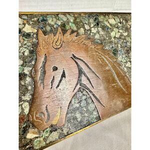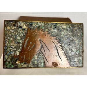 Beautiful vintage trinket box/cigar box, Los Castillo attributed, Mexico 1950's. Fantastic box, beautifully crafted with brass and copper inlay on a stone mosaic (malachite and lapis). The box is made of brass and lined with rosewood. The copper horse's head is the main focal point of the box. Such a wonderful gift for the horse enthusiast.