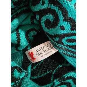 Vintage Mexican Poncho Black & Teal Floral Embroidered Wool Blend One Size Fits