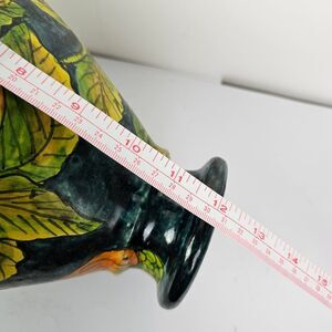 This stunning handcrafted ceramic vase features a vibrant, eye-catching design of lush, ripe oranges set against a backdrop of rich, verdant leaves. The intricate details and bold colors create a captivating piece that will add a touch of rustic charm to any space. Perfect for displaying fresh flowers or simply as a decorative accent, this vase is a true work of art.