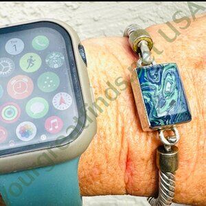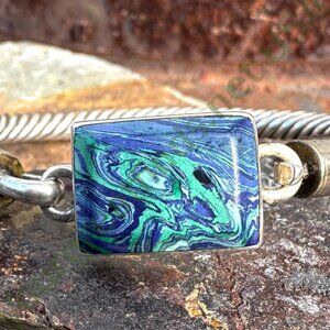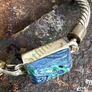 Vintage Mexican sterling silver cable bangle bracelet. The stone is man made to look like azurite/malachite. I am not sure if it is glass or resin. Interior measures a circumference is 6 1/2” Cable has a diameter of 5.9mm. Weight: 33.7 grams. Hallmarked on the back of the stone setting, Made in Taxco.