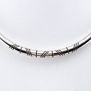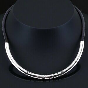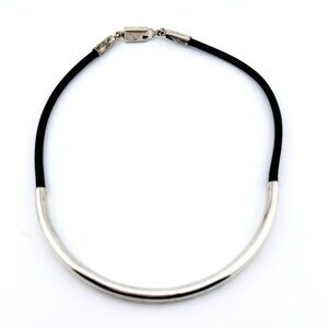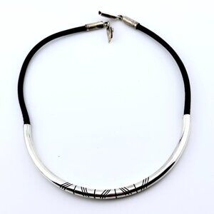 Vintage sterling silver and black cord choker marked MEXICO 925 TH-103, crafted in Taxco. Features a polished silver front bar with engraved accents and a secure box clasp. Solid 37.5g weight. Fits close to the neck (about 15–16"). Excellent vintage condition with mild patina. Unisex modernist look — sleek and collectible.
