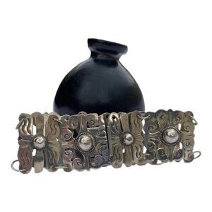 Beautiful Mexican Craftsmanship. Sterling silver 8 panel link bracelet with hinged clip closure. Measuring approx. 8.5" inches end to end. Will fit a 6.5 to 7-inch wrist nicely. 8 panel sterling silver with beautiful details. Good vintage condition- shows normal signs of wear.