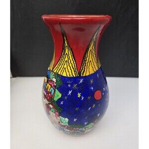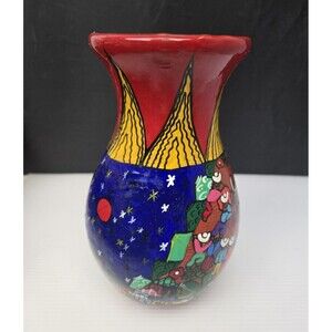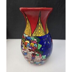 Vintage Mexican Storyteller Vase Hand Painted Folk Art Terra Cotta Clay 7.5"