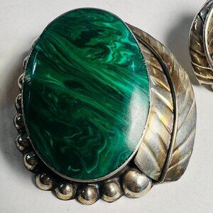 Vintage Mexican TAXCO TC-25 Sterling Silver & Malachite Brooch & Post Earrings Set Jewelry with Feather design. This elegant vintage set includes a brooch and matching earrings with beautiful malachite stones set in sterling silver with feather design, offering a classic look.