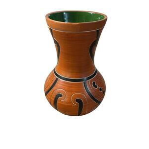 Vintage Mexican Terracotta Vase 9" Folk Art Pottery Green Glazed Interior