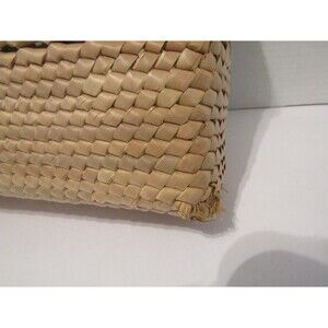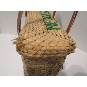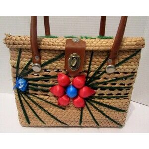 Vintage Mexican Woven Straw Purse Raffia Flowers Leather Straps Basket Box