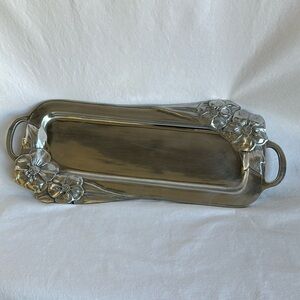 Vintage pewter serving tray. Generally good preowned condition; could use a good cleaning/polishing with pewter-specific cleaner. Flamingo Model 4513. Hand made in Mexico. Handles on long ends. Three-dimensional floral treatment on two opposite corners. Measures about 20” long by 8” deep. About 0.5” high at highest point. Bound to impress your guests.