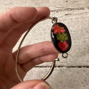 Vintage Mexican Alpaca Silver Pressed Flower Bangle Bracelet