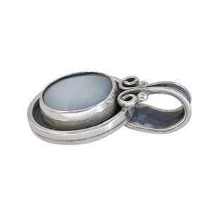 This vintage pendant features a radiant mother of pearl stone framed by a bold sterling silver setting with elegant scroll details. Handmade in Mexico, it exudes timeless craftsmanship and charm. Ideal for enhancing both formal outfits and everyday wear with a touch of vintage sophistication.