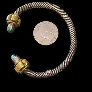 Very nicely made vintage Mexico sterling silver cuff with brass accents and malachite end caps. This is a hefty bracelet with a designer take on a traditional design.