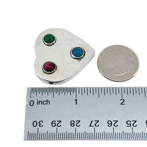 This vintage heart-shaped pendant from Mexico features vibrant gemstones—chrysoprase, rubellite, and blue agate—set against a polished sterling silver background. The bold design and colorful cabochons make this pendant a standout piece. Its substantial weight and size allow it to be a unique statement accessory, perfect for casual wear or special occasions. The bale opening measures 2.5mm, ideal for pairing with various chains.