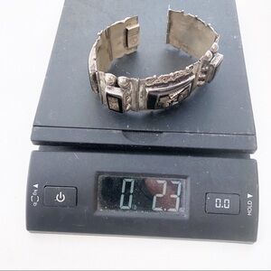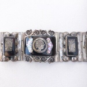 Large Vintage 1930’s Mexican Sterling Silver inlay handmade Bracelet. Designed as raised hinged panels inlaid abalone shell and silver South American images, scroll and bead surrounds. Stamped Sterling Mexico Hecho En Mexico TND 0925.
