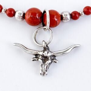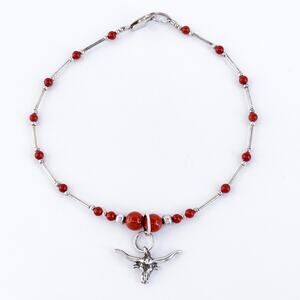 This vintage anklet features vibrant red glass beads paired with sleek silver tube links and a striking Texas longhorn charm centerpiece. Crafted in Mexico from sterling silver, it captures a bold Southwestern spirit with playful flair. Perfect for summer outfits, festivals, or adding character to casual looks.