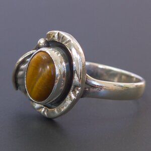 Keywords: Mexico sterling, 925 ring, tiger’s eye cabochon, vintage silver ring, leaf motif, bead detail, boho silver, pinky ring size 5.5, artisan jewelry, stamped backplate, bezel set, cat’s-eye chatoyancy