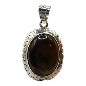 Vintage Mexico Taxco 925 Silver Tiger Eye Oval Pendant With Intricate Design